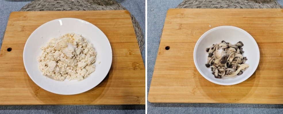 4. 두부는 물기를 짜서 으깨 참기름과 소금으로 간을 하고 느타리버섯은 끓는 물에 데쳐 물기를 꼭 짠 다음 참기름과 소금으로 조물조물 간을 해줍니다.