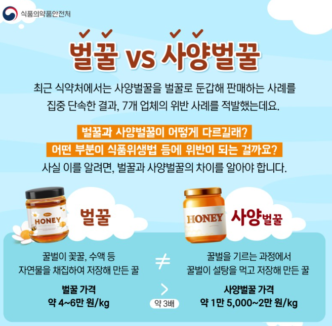 식약처에서는 사영벌꿀을 벌꿀로 둔갑해 판매한 7개의 업체를 적발한 적이 있습니다. 대체 벌꿀과 사양벌꿀은 어떻게 다른 건지 어떤 부분이 법적으로 위반되는 건지 알아보겠습니다.