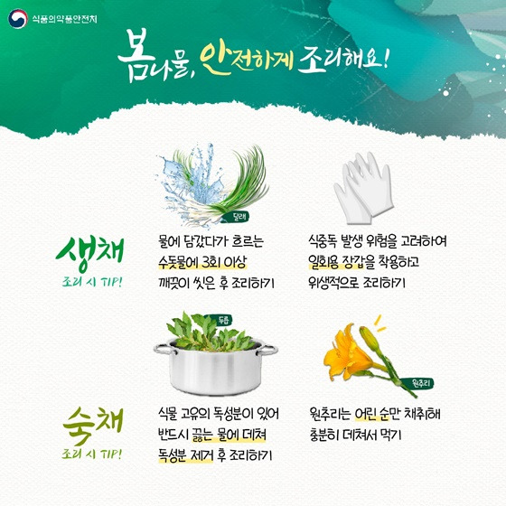 ✔ 도시 하천변 등에서 자라는 야생 봄나물은 농약, 중금속 등의 오염이 높을 수 있으므로 가급적 채취하지 말고, 구입한 봄나물도 반드시 올바른 조리법을 지켜야 합니다.