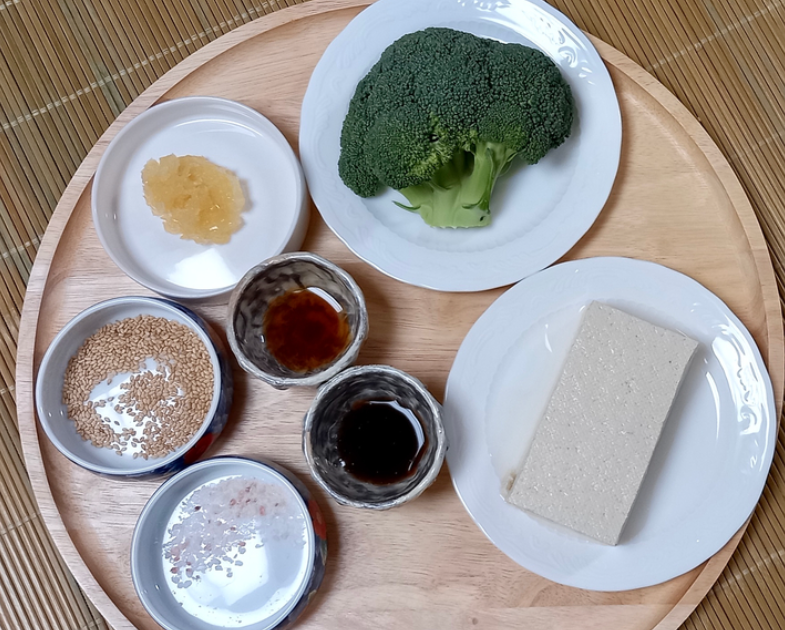 브로콜리 반송이, 두부 반모, 소금, 다진 마늘, 참기름, 깨소금, 국간장