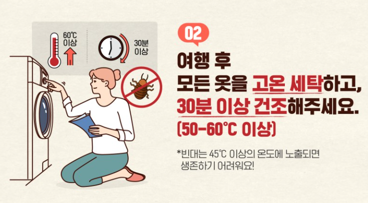 여행 후 모든 옷을 고온 세탁하고, 30분 이상 건조해주세요.(50~60℃ 이상)