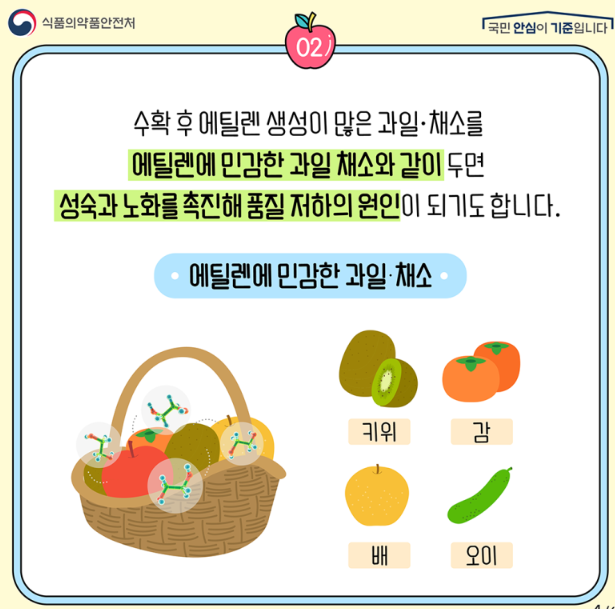 에틸렌에 민감한 과일·채소는 키위, 감, 배, 오이 등이 있습니다.