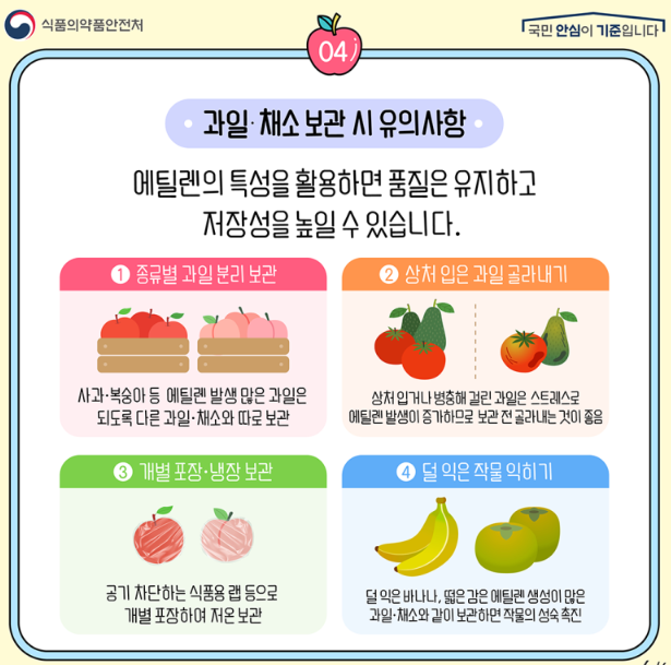 과일·채소 보관 시 에틸렌의 특성을 활용하면 품질은 유지하고, 저장성을 높일 수 있습니다.