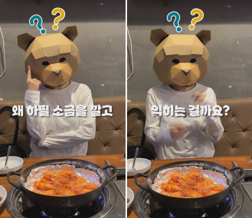 덕분에 구우며 흘러나온 새우의 수분과 육즙은 소금에 흡수되어 새우가 촉촉하게 구워지는 것입니다.