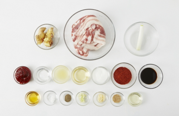 삼겹살 600g, 생강 200g, 대파 1대, 소금 1/4t, 맛술 2T, 후춧가루 1/4T, 식용유 1T, 양념장(설탕 2T, 고춧가루 3T, 다진 파 1/2T, 다진 마늘 1/2T, 생강즙 2T, 고추장 3T, 간장 2T, 물엿 2T, 참기름 1T, 깨 1/2t, 후춧가루 1/4t)