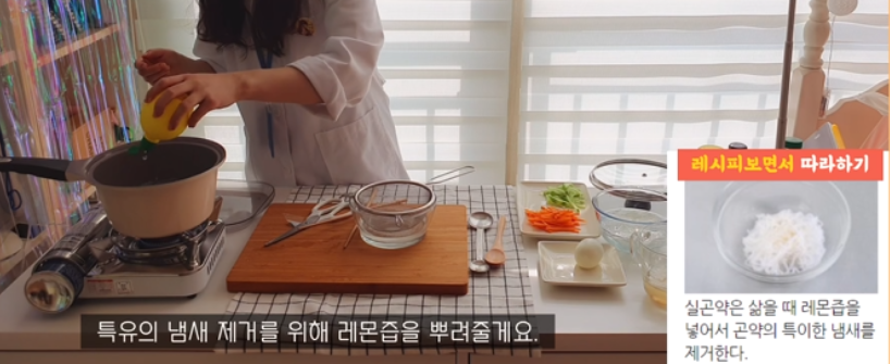 4. 이제 실곤약을 데쳐줍니다. 끓는 물에 넣어 주고 특유의 냄새 제거를 위해 레몬즙을 뿌려줍니다.