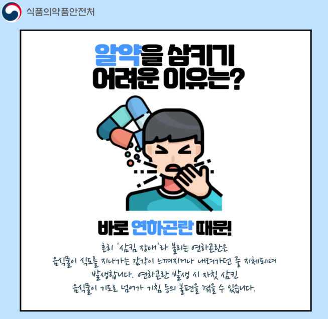 알약을 삼킬 때 목구멍이 턱 막히는 듯한 답답함을 느끼는 증상이 나타날 때가 있습니다. 이것은 흔히 '삼킴 장애'라 불리는 '연하곤란' 증상이라고 합니다. 연하곤란은 삼킨 음식물이 식도를 지나가는 느낌이 들거나, 내려가던 중 지체되어 발생하며, 자칫 삼킨 음식물이 기도로 넘어가 반사작용으로 기침이 나는 등의 불편을 일으킬 수 있다고 합니다.