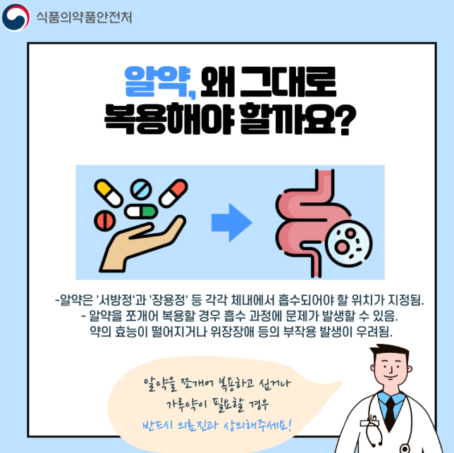 알약의 종류에는 '서방정'과 '장용정'이 존재합니다. 서방정은 몸 안에서 천천히 녹으며 안에 담긴 성분들이 각각 필요한 위치에 맞춰 흡수시키고, 장용정은 장까지 장에 필요한 성분을 공급해 줍니다. 즉, 두 종류의 알약 모두 성분이 필요한 위치까지 도달해야 하는 것입니다. 그런데 약을 쪼개거나 가루를 내어 복용할 경우 흡수에 문제가 생깁니다. 올바른 위치에 약의 성분이 흡수되지 않아 효능이 감소할 수 있고, 위장장애 등의 부작용이 발생할 수 있기 때문입니다. 그러므로 알약을 잘게 쪼개어 복용하고 싶거나 가루약이 필요한 경우 반드시 의료진과 상의해야 합니다.