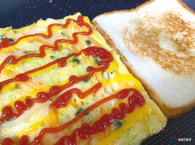 식빵 2장, 양배추 24g, 당근 1/5개(23g), 쪽파 1개, 양파 1/4개, 계란 2개, 치즈 1장, 햄 1장, 설탕 1/2t, 소금 1/4t, 식용유 1T, 버터 1T, 토마토케첩, 허니 머스터드소스