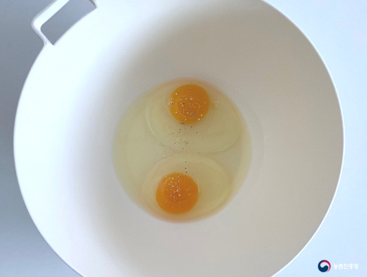 2. 계란 2개를 볼에 깨 준 후 소금 1/4t을 넣고 부드럽게 풀어 준 다음, 썰어 놓은 재료를 넣어 함께 섞어줍니다.