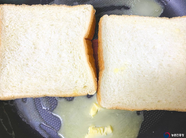 5. 종이 행주로 프라이팬을 한번 닦아주고 버터 1T를 녹인 다음, 식빵 2장을 올려 앞뒤로 노릇노릇 구워줍니다.