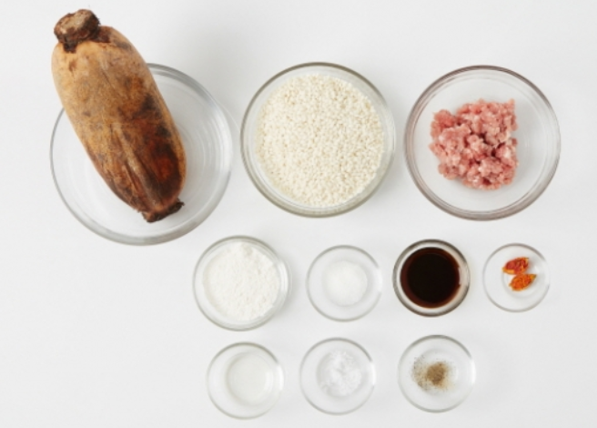 찹쌀 1컵, 연근 15cm로 360g, 다진 돼지고기 60g, 치자 1개, 찹쌀가루 2숟가락, 소금 1/8숟가락, 후춧가루 약간, 설탕 1/2숟가락, 간장 2숟가락, 식초 1/2숟가락, 물 1숟가락