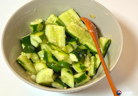 쓴맛이 덜하고 과육이 단단한 편이어서 오이소박이, 샐러드 등으로 만들어 먹으면 아삭함이 일품이라고 합니다.