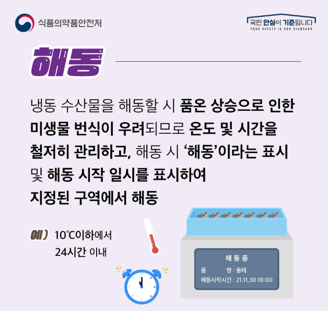 냉동 수산물을 해동할 시 품온 상승으로 인한 미생물 번식이 우려되므로 온도 및 시간을 철저히 관리하고, 해동 시 '해동'이라는 표시 및 해동 시작 일시를 표시하여 지정된 구역에서 해동합니다.