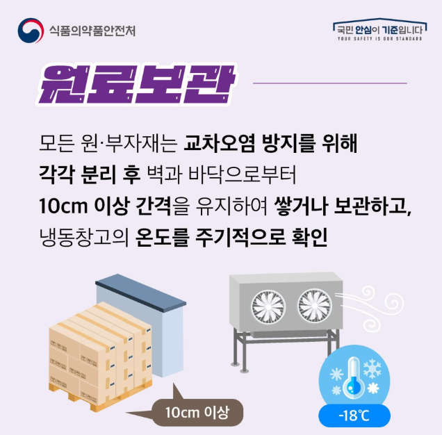 모든 원·부자재는 교차오염 방지를 위해 각각 분리 후 벽과 바닥으로부터 10cm 이상 간격을 유지하여 쌓거나 보관하고, 냉동창고의 온도를 주기적으로 확인합니다.