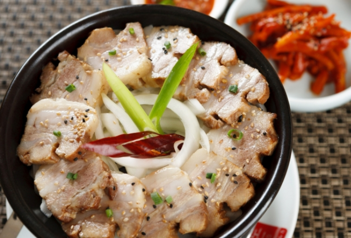 4. 조리된 삼겹살을 먹기 좋은 크기로 잘라 접시에 올립니다.