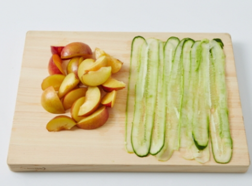 1. 자두는 씨를 제거해 4~6등분하고, 오이는 감자칼로 길게 깎아 굵은소금 1/3T에 10분간 절입니다.
