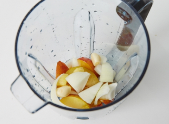 5. 믹서에 자두 2개 분량과 양파, 마늘, 생강, 물 1/2컵을 넣어 곱게 갈아줍니다.