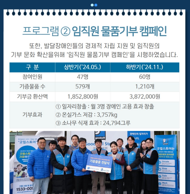 또한 임직원 물품기부캠페인을 통해 발달장애인의 경제적 자립 지원 및 임직원 기부 문화를 확산하기 위해 '임직원 물품기부 캠페인'을 시행하고 있다고 합니다.