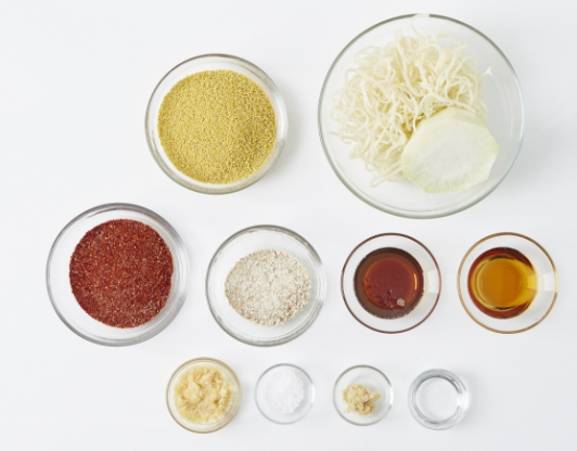 조 2컵, 무 250g, 진미채 4줌(160g), 굵은 소금 1t, 엿기름가루 1/4컵, 양념(고춧가루 2/3컵, 까나리액젓 3T, 매실청 3T, 다진 마늘 2T, 물엿 1T, 다진생강 1t)