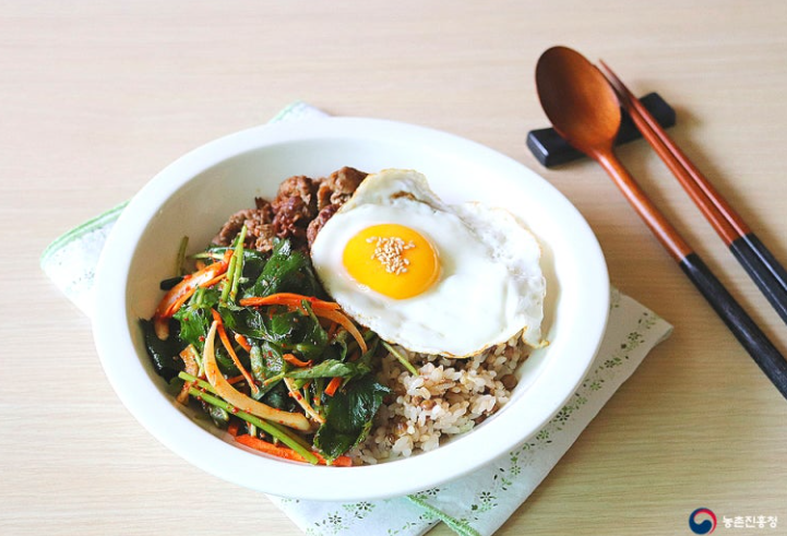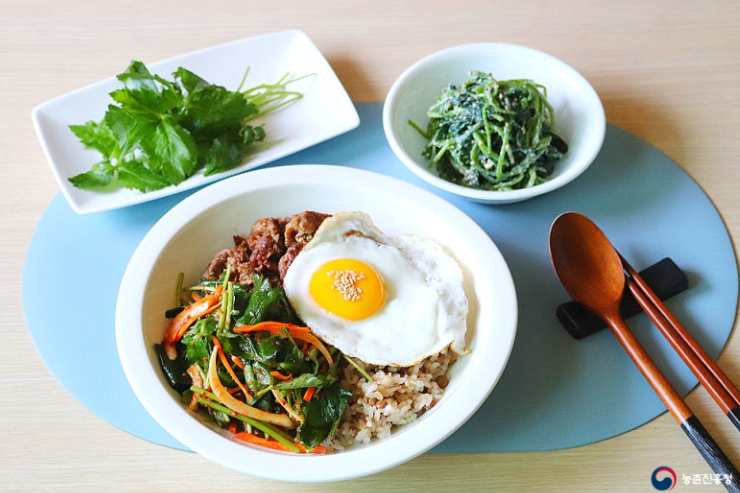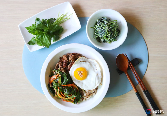 7. 그릇에 밥 1 공기를 담고 소불고기와 참나물생채무침을 소복하게 올린 뒤 달걀 프라이를 올려줍니다.