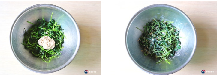 데친 후에는 바로 찬물에 헹궈줘야 엽록소가 빠져나가는 것을 방지할 수있다고 합니다.