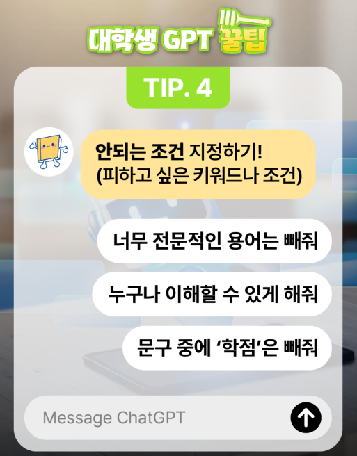"문구 중에 '학점'은 빼줘." 또는, "너무 전문적인 용어는 빼고, 누구나 이해할 수 있게 설명해 줘."