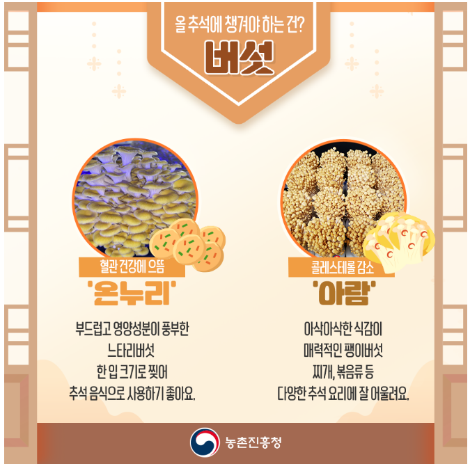 안녕하세요 건강한 음식 '건음'입니다. 오늘은 농촌진흥청에서 개발한 국산 버섯 7가지 흰색 양송이·갈색 양송이·흰색 팽이·갈색팽이·흰색 느타리·노랑 느타리·산느타리(고기느타리)를 농촌