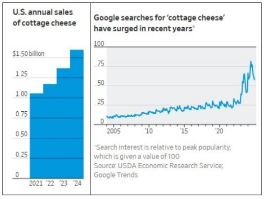 '고단백' 유제품 시장에서 코티지 치즈(Cottage Cheese)가 그릭 요거트(그리스식 요거트)의 인기를 잇는 아이템으로 떠올랐습니다. 단백질이 많으면서 비교적 낮은 열량이 강점입니다.