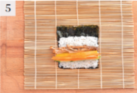 5. 김발 위에 김을 깔고 밥을 2/3지점까지 고루 펼친 뒤 모든 재료를 가지런히 올려줍니다.