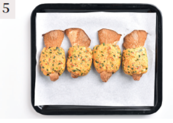 3. 크리미버섯의 양쪽 끝은 남기고 가운데에 두부 반죽을 얹어 동그랗게 감싸줍니다.