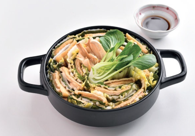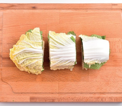 4. 알배추 → 깻잎 → 크리미버섯 → 유부 순서로 쌓은 뒤 3등분합니다.