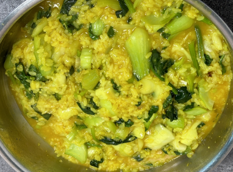 청경채 2컵, 시금치 2컵, 마늘 2쪽, 대파 2대, 샬롯 1/4컵, 코코넛밀크 1캔 또는 코코넛 1개, 채수 2와 1/4컵, 재스민쌀 1과 1/2컵, 흑후추 1/4작은술, 천일염 1/2작은술, 강황 1작은술, 올리브오일 1큰술