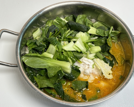 4. 청경채, 시금치를 비롯한 모든 재료(대파 제외)를 넣고 2분 동안 저어 익힙니다.
