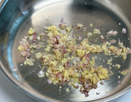 3. 측면이 높은 큰 팬에 중불에 올린 후, 올리브유를 붓고 줄인 후에 샬롯과 마늘을 넣어 향이 날 때까지 익혀줍니다.(타지 않게 주의)