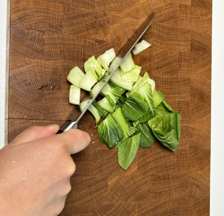 2. 마늘, 대파, 샬롯을 다지고 청경채와 시금치는 한입 사이즈로 자릅니다.