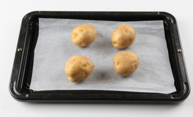 1. 감자는 껍질째 깨긋이 씻어 십자모양으로 깁게 칼집을 내어 180℃에 예열된 오븐에서 15분 정도 굽습니다.