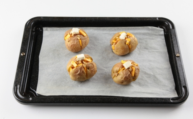 5. 구운 감자에 버터, 슬라이스 치즈, 견과류를 올린 뒤 180℃로 예열된 오븐에서 25분간 굽습니다.