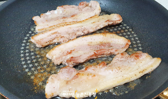 3. 센 불로 달군 팬에 삼겹살을 올리고 소금, 후춧가루를 뿌린 뒤 앞뒤로 노릇하게 구워냅니다.