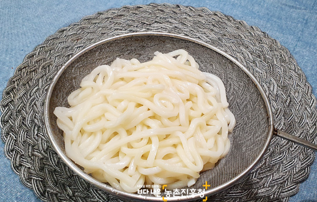 2. 가락국수 면을 끓는 물에 담가 굳어있던 면을 풀어준 다음 체에 밭쳐 둡니다.