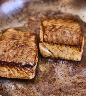 3. 키친타올에 할리벗 필렛의 물기를 가볍게 제거한 다음 소금과 레몬 후추로 간을 합니다. 후라이팬에 식용유를 넣고 중불로 가열한 다음, 밑간을 한 필렛에 밀가루를 살짝 묻힌 후 반투명해질 때까지 양면을 3분 정도 굽습니다.