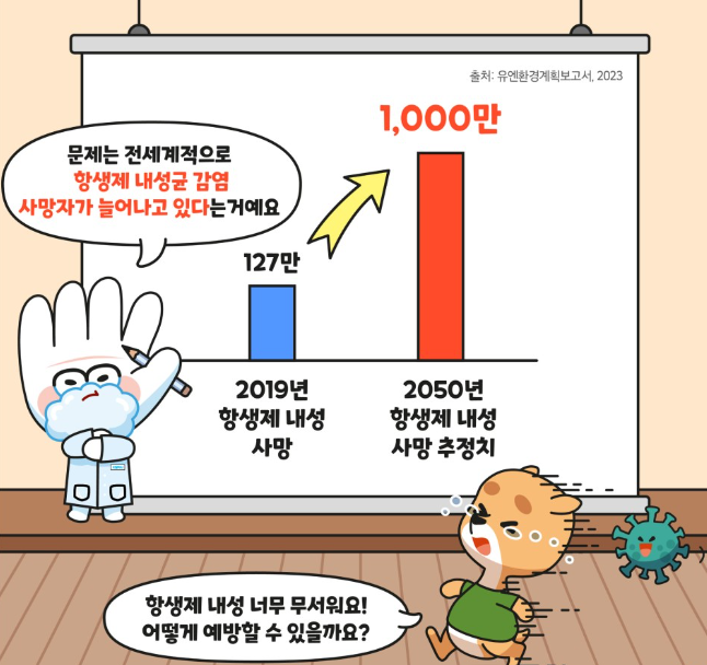 2019년 항생제 내성 사망자 127만 명, 2050년은 사망자 추정치 1,000만 명으로 예상된다고 합니다.