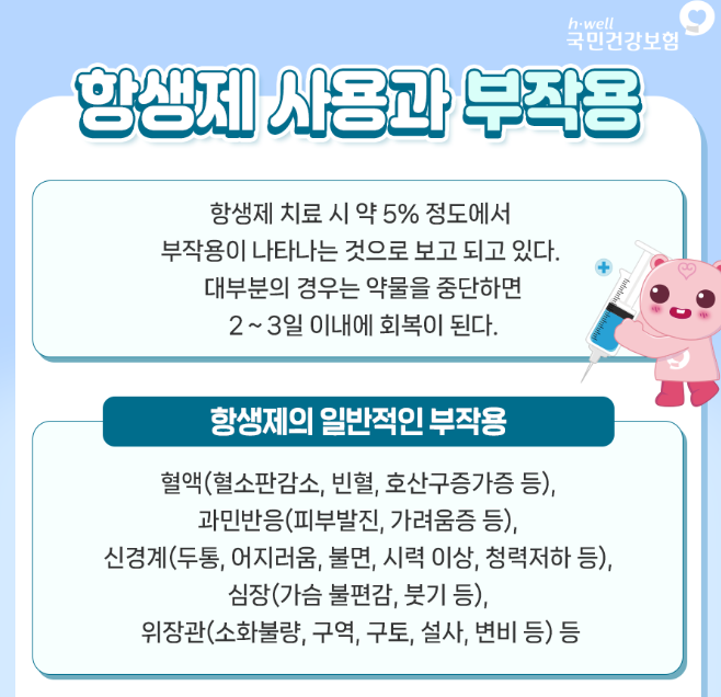 ✔ 항생제 치료 시 약 5% 정도에서 부작용이 나타나는 것으로 보고 되고 있습니다. 대부분의 경우는 약물을 중단하면 2~3일 이내에 회복이 됩니다.