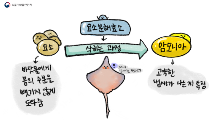 그럼 이제 삭힌 홍어는 암모니아가 특징이라는 것을 알게 되었습니다. 특유의 향과 맛, 그리고 잘 상하지 않게 해주는 암모니아는 왜 만들어지는 걸까요?