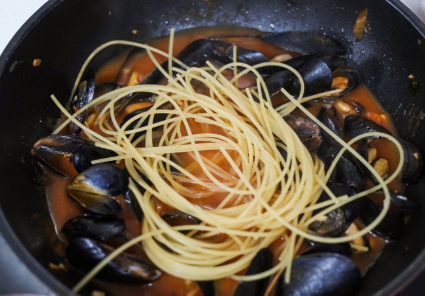홍합, 파스타 면, 토마토 소스, 다진 마늘, 다진 파, 다진 양파, 청주(소주or미림), 치킨스톡