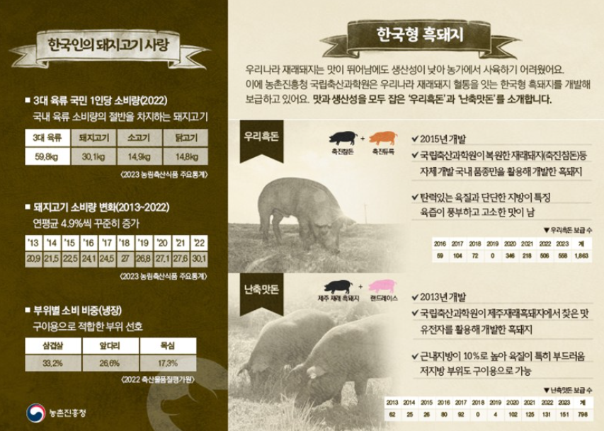 우리나라 재래돼지는 맛이 뛰어남에도 불구하고, 생산성이 낮아 농가에서 사육하기 어려웄습니다. 그래서 농촌진흥청에서 우리나라 재래돼지 혈통을 잇는 한국형 흑돼지로 맛과 영양, 생산성 모두 잡은 '우리흑돈'과 '난축맛돈'을 개발했다고 합니다.